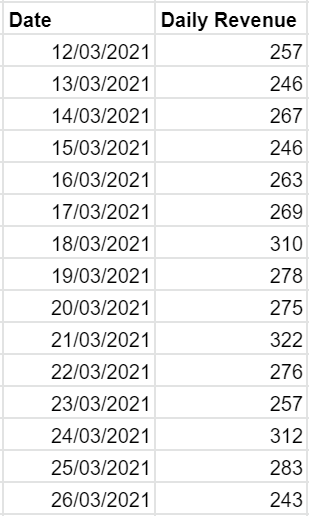 To carry out the efficient frontier method, you need one key piece of data: your daily revenue figures. To get your projected revenue, you need to put your key figures in a Google Sheets or Excel table like this: