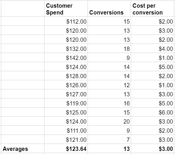 From there, you need to calculate the mean figure for your 'customer spend', 'conversions,' and 'cost per conversion' categories. You can calculate the mean by adding all your figures together and dividing them by the total number of figures (i.e. '(45 + 34 + 28)/3 = 35.6').