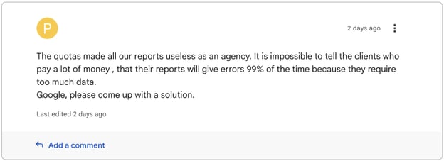After the Google Analytics 4 quota limitations started getting enforced in November, many Looker Studio users started having problems with their reports. Some users started sharing their concerns in the Looker Community post where it was announced.